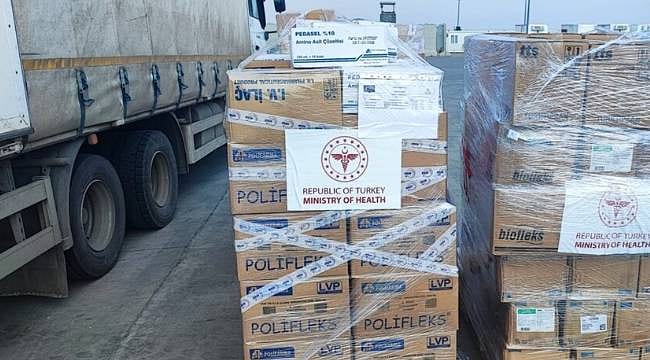 Burada hazırlanan yardım malzemeleri, İl Sağlık Müdürlüğü personelince tırlara yüklendi.