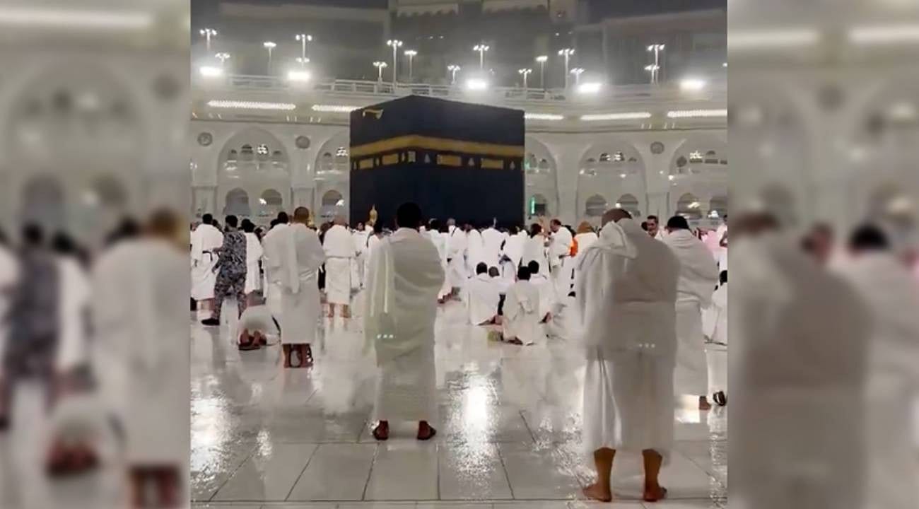 Mekke Bölge Emirliğinin sosyal medya hesabından paylaşılan görüntülerde, Kabe çevresinde sağanak altında tavaf yapan ve ellerini semaya açan ziyaretçilerin yoğunluğu dikkati çekti.