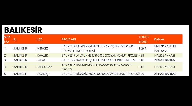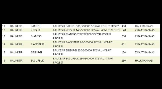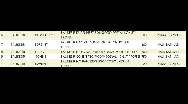 | 1 | BALIKESİR | MERKEZ | BALIKESİR MERKEZ (ALTIEYLÜL,KARESİ) 3267/500000 SOSYAL KONUT PROJESİ | 3.267 |