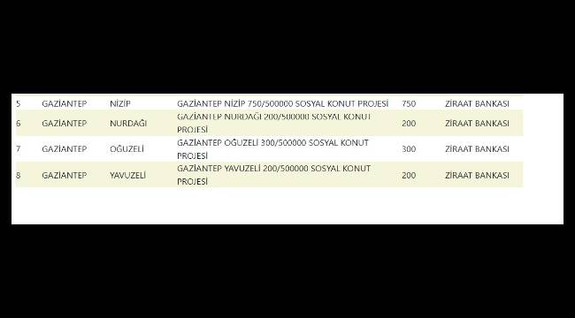 | 5 | GAZİANTEP | NİZİP | GAZİANTEP NİZİP 750/500000 SOSYAL KONUT PROJESİ | 750 |