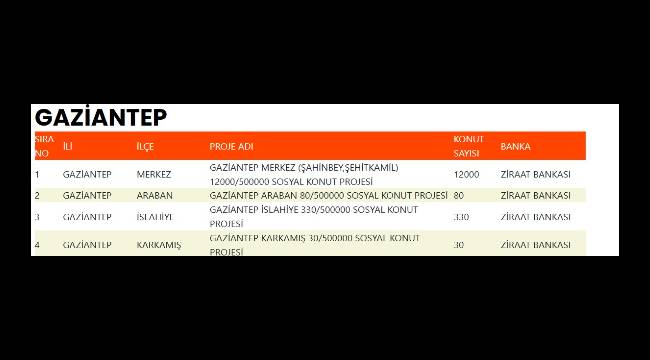 | 1 | GAZİANTEP | MERKEZ | GAZİANTEP MERKEZ (ŞAHİNBEY,ŞEHİTKAMİL) 12000/500000 SOSYAL KONUT PROJESİ | 12000 |