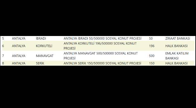 | 7 | ANTALYA | MANAVGAT | ANTALYA MANAVGAT 500/500000 SOSYAL KONUT PROJESİ | 500 |