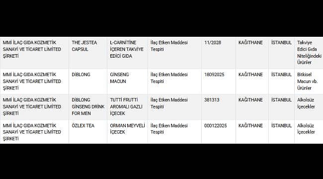 | MMI İlaç Gıda Kozmetik Sanayi ve Ticaret Limited Şirketi (Özlex Tea) | Orman Meyveli İçecek | İlaç etken maddesi tespiti |