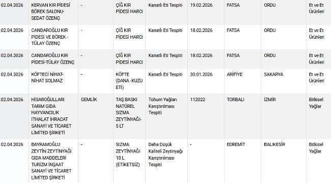 Bakanlık, sağlığı tehlikeye düşürecek gıdalar listesine de yeni ürünler ekledi. 2 Nisan 2026 tarihinde yapılan güncellemeyle listeye şu ürünler eklendi: