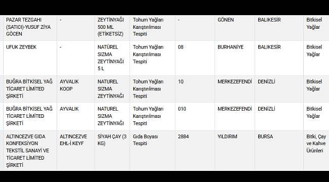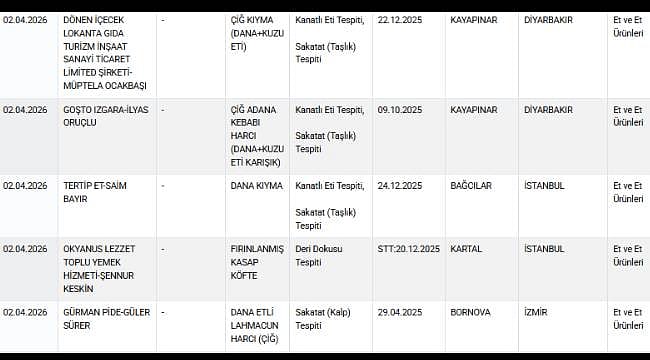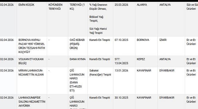 Güncellenen listede tereyağında bitkisel yağ karışımı, dana kıymada kanatlı eti, lahmacun ve Adana kebabı harçlarında sakatat, fırınlanmış kasap köftede deri dokusu ve çiğ kır pidesi harcında kanatlı eti bulundu.