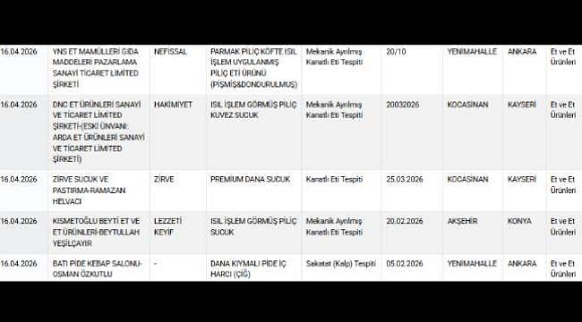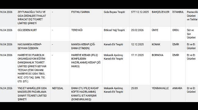Listeye yeni marka ve ürünler eklenirken, yapılan denetimlerde ürünlerin içinden çıkanlar dikkat çekti. Buna göre bir markanın dana pide harcında tek tırnaklı etine rastlanırken; çikolata, macun ve gazlı içecekte ilaç etken maddesi tespit edildi. Yine başka bir markanın fıstıklı sarmasında gıda boyasına, dana etli piliç kasap köftede mekanik ayrılmış kanatlı eti tespitine rastlandı.