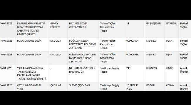 | Kimplus Kimya Plastik Gıda Temizlik Peyzaj Sanayi ve Ticaret Limited Şirketi (Güney Egeden) | Natürel sızma zeytinyağı (5 L) | Tohum yağları karıştırılması tespiti |