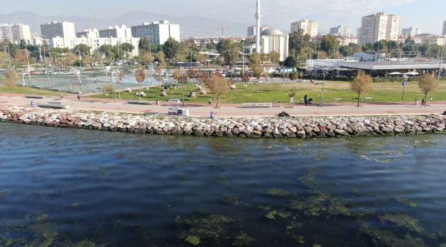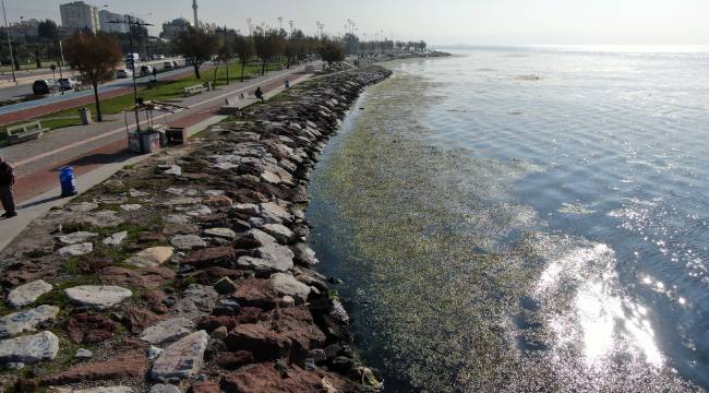 İzmir Körfezi'nin Bostanlı kıyılarında sabah saatlerinden itibaren deniz yüzeyinde yoğunlaşan yeşil görüntü dikkat çekti. Sahil bandının kıyı kesimlerinde biriken ve deniz marulu olarak adlandırılan su yosunları, denizin rengini değiştirirken kıyıya vuran ve su yüzeyini kaplayan yeşil tabaka, sahil boyunca geniş bir alanda gözlemlendi.