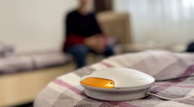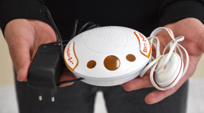 Yastık altına yerleştirilen ve acil durum uyarı sistemine bağlı sensörlerden gelen sinyali algılayarak devreye giren cihaz, güçlü titreşim oluşturarak işitme engelli kişiyi uyarıyor.