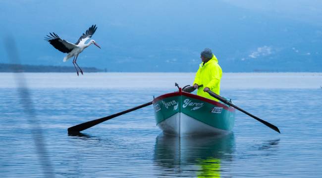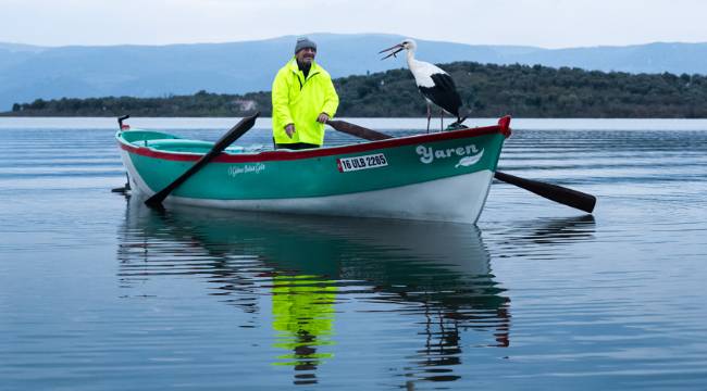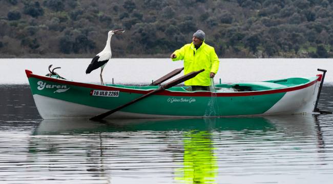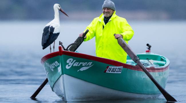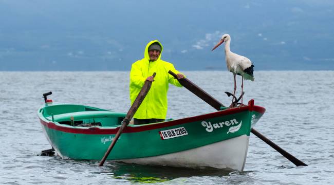 Yaren leyleğin, göl manzaralı yuvasının bulunduğu mahallede balıkçı Yılmaz'ın kayığındaki geleneksel pozu, doğa ve yaban hayatı fotoğrafçısı Alper Tüydeş tarafından kayda alındı.