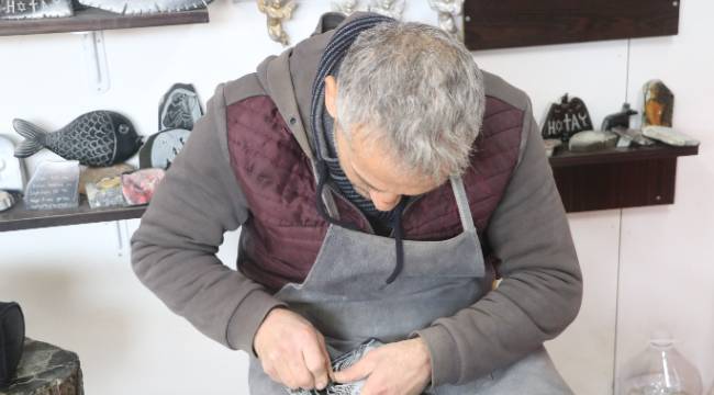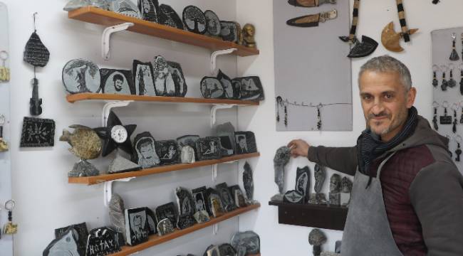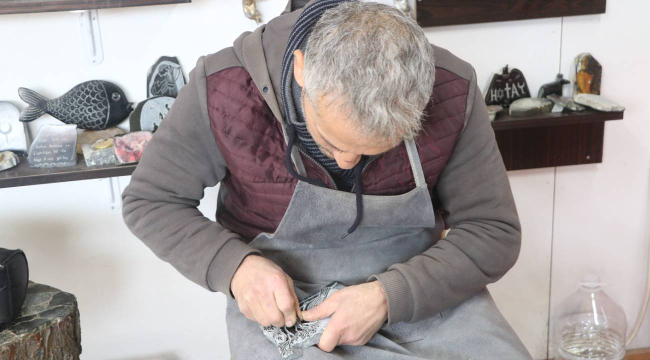 Hatay’da arkadaşının tavsiyesi üzerine hobi olarak başladığı serpantin taşı işleme sanatını yıllar içinde mesleğe dönüştüren Ali Güler, 25 yıldır ekmeğini taştan çıkarıyor.